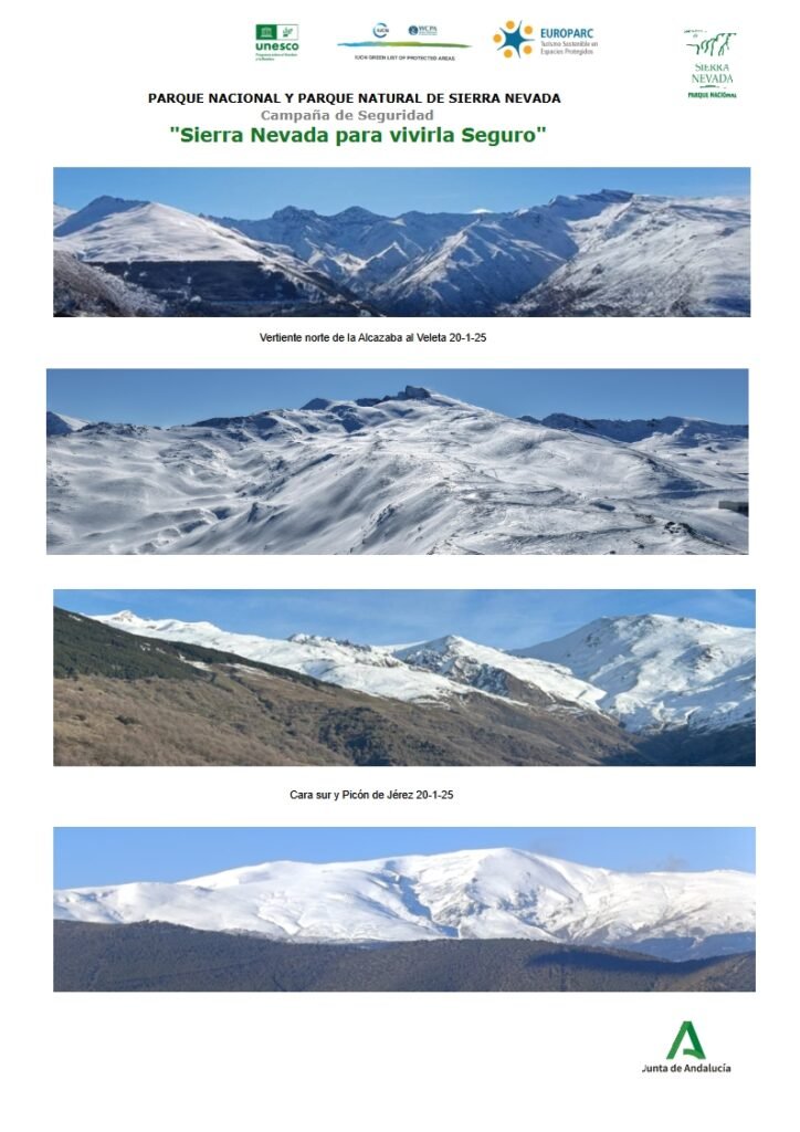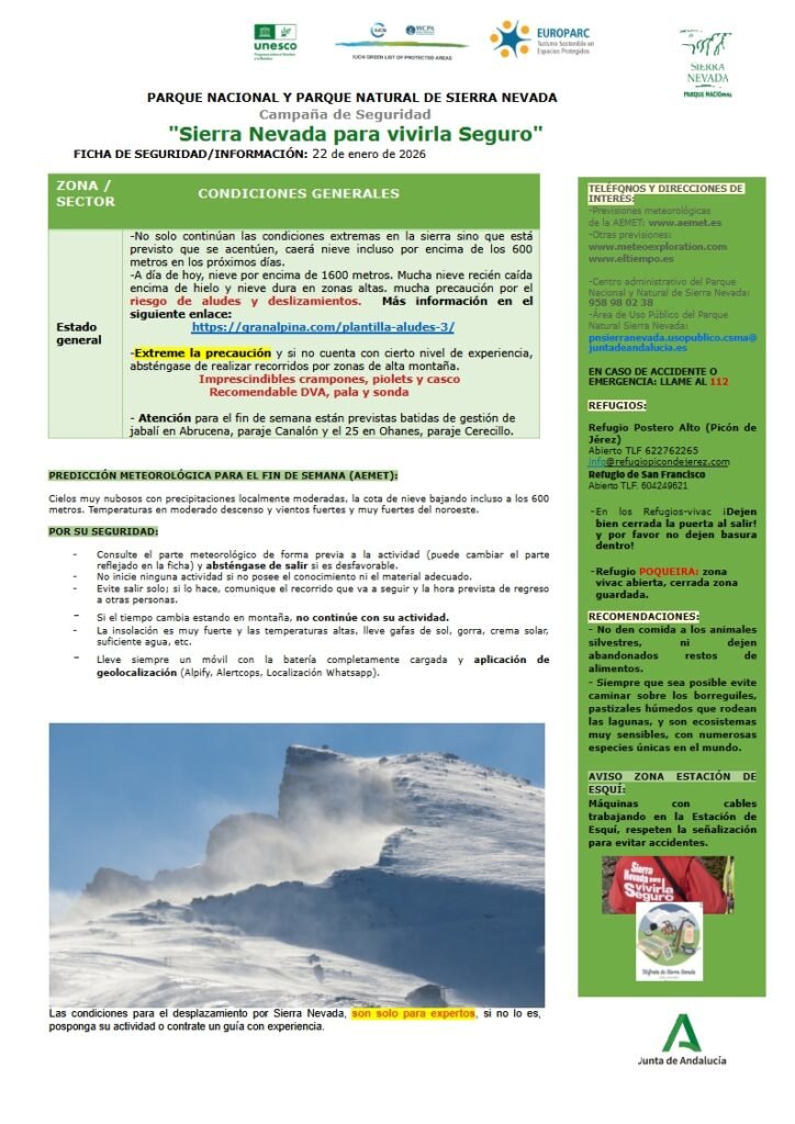 Es fundamental seguir todas las recomendaciones emitidas por el Parque Nacional y Natural de Sierra Nevada. Consulte las condiciones meteorológicas actualizadas antes de cualquier salida y, si es posible, realice actividades acompañado de guías de montaña especializados.